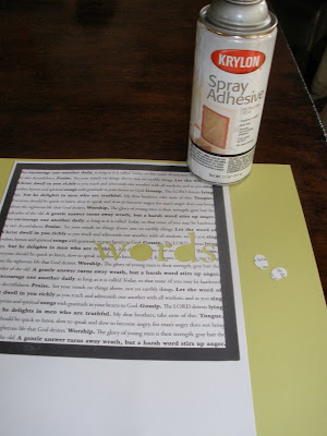 Then I took an exacto knife and cut out the large letters that spelled “words”. I shot the back of the cardstock with spray adhesive and glued it to colored cardstock. I also went over it with a brayer to ensure it was firmly adhered to the colored paper.