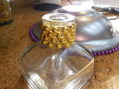 While the glue on the bowl was setting, I took more beads and glued them on to the neck of the little glass bottle.