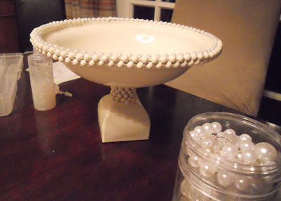 An idea started formulating in my mind… I had a little glass vase/jar from an old reed-diffuser and decided it would be a nice base for a footed bowl. I figured some plastic beads from the Dollar Tree would be just the right thing to add some detail.